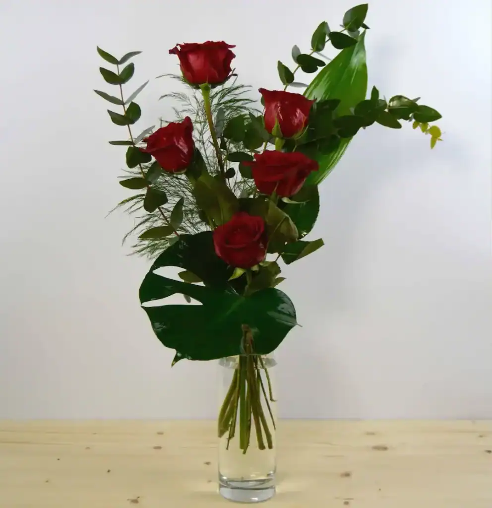 Cinco rosas rojas con verdes: el clásico romántico que funciona siempre.